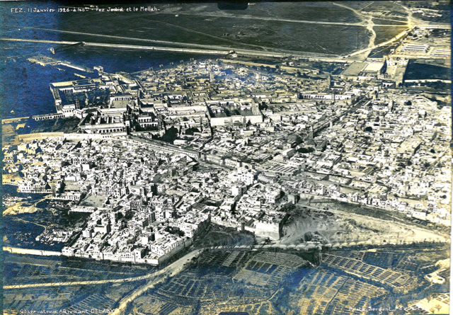 Photographie aérienne 1926 : Le Mellah et Fès-Jdid. Au premier plan jardins et pépinières.