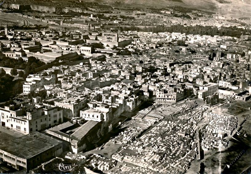 Au premier plan le Palais du Sultan, au fond en demi-lune, le mellah. En haut, à droite, la place du Commerce.