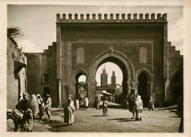 L’ esplanade de Boujeloud : on voit les « bnika » et en haut une porte à chapiteau appelée selon les moments : Bab Chems, Bab Boujeloud ou Porte des Français.