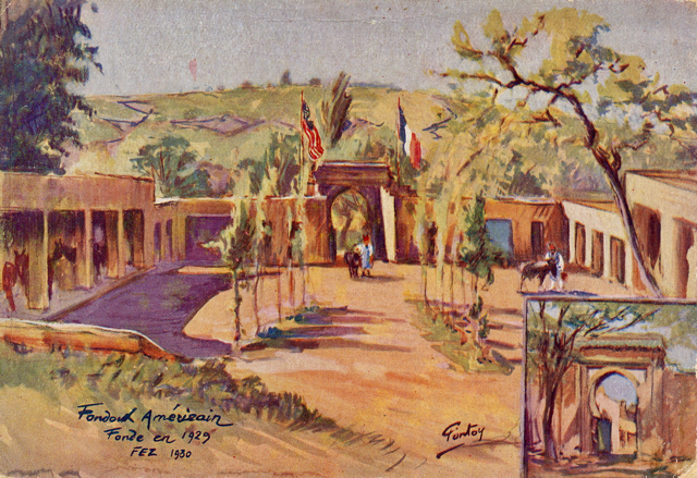 Image à la une : carte postale – publicitaire – représentant un tableau de Pontoy, confirmant la création du fondouk en 1929…..et qui permet en même temps d’admirer le talent de Pontoy, peintre orientaliste qui fut un temps professeur d’arts et lettres au Collège Moulay Idriss de Fès.