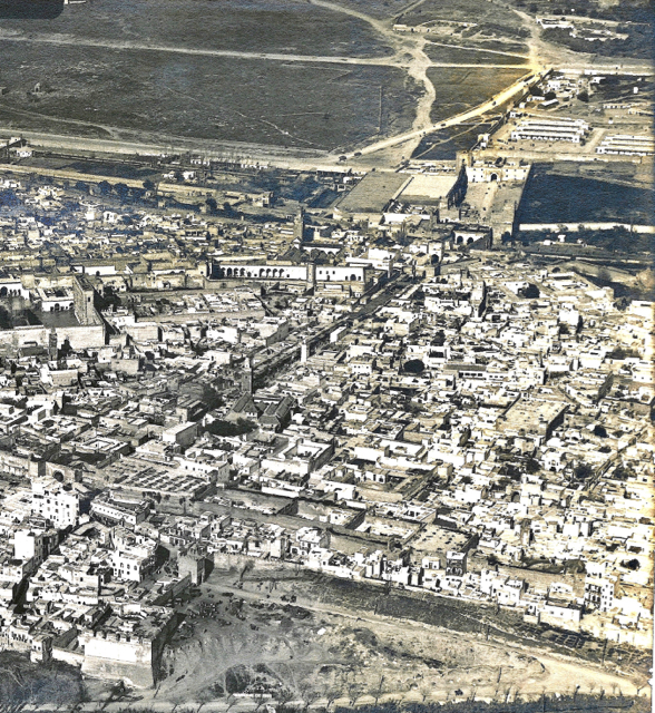Vue aérienne de Fès-Jdid avec au centre et à gauche le Palais ; au centre en diagonale la grande rue de Fès-Jdid