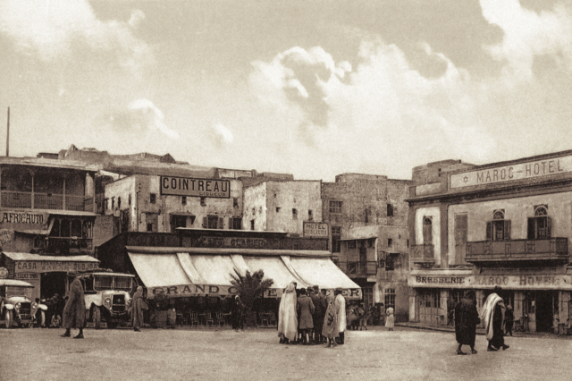 Jetons un premier regard autour de cette Babylone moderne, ses apparences et ses réalités, surtout nocturnes. Avec une grande banque, le Maroc Hôtel occupe tout un côté de la place du Commerce, extrêmement animée, poussiéreuse et bruyante avec ses cafés, ses calèches, ses camions, ses autobus et une multitude de cars pour toutes les directions.