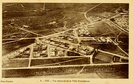 Vue aérienne de Fès, par Flandrin, vers 1920. En bas au 1/3 droit, départ du Bd Poeymirau (Bd Mohammed V) avec à sa droite, les bâtiments des Grands Moulins Fasis. Au centre, le « triangle » de Fez V-N initial. Les tracés de l’av. Maurial et de l’av. de France aboutissent à la gare de la voie de 60 ( 1/3 bord gauche). En haut à droite, on distingue les remparts du palais royal
