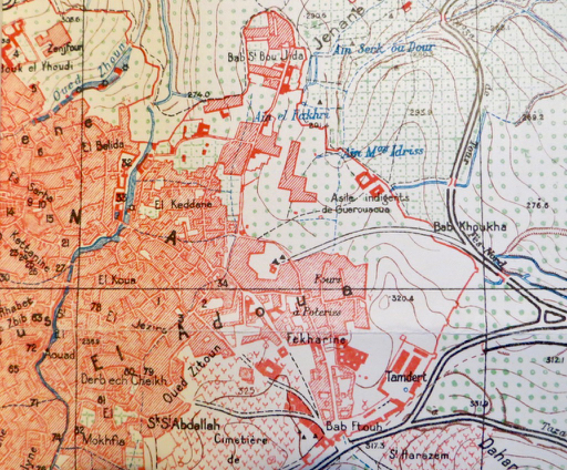 Image à la une : le quartier du Keddan, détail d’un plan de Fès de 1938. Au centre, en haut Bab Sidi Bou Jida ; en bas, Bab Ftouh ; à droite, au centre Bab Khoukha ; à gauche et qui limite le quartier l’oued Boukhareb.