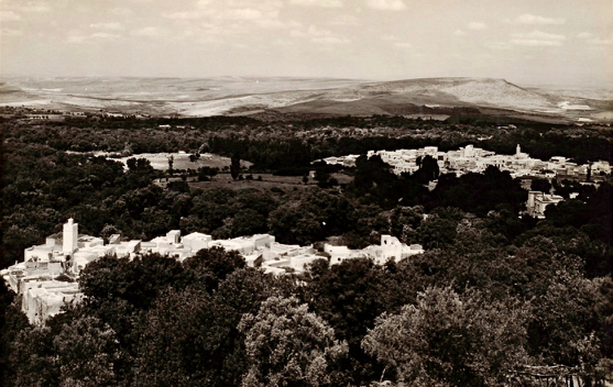 Vue prise de la route d’Annoceur : Sefrou dans les jardins et en arrière-plan, le Djebel Binna et les coteaux de Bahlil. Non datée.