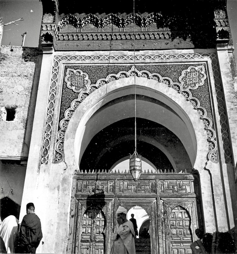 Grande porte Nord de la Mosquée des Andalous. Cliché anonyme et non daté. Cette porte est une des rares entrées de mosquées de Fès que l’on puisse admirer avec un recul suffisant et sa haute silhouette domine tout le quartier. On l’aperçoit également depuis le bordj nord, les Mérinides ou le Palais Jamaï. Elle est la reproduction d’une porte intérieure de l’Alcazar de Séville et fut exécutée en 1204, par des ouvriers maures venus de Séville