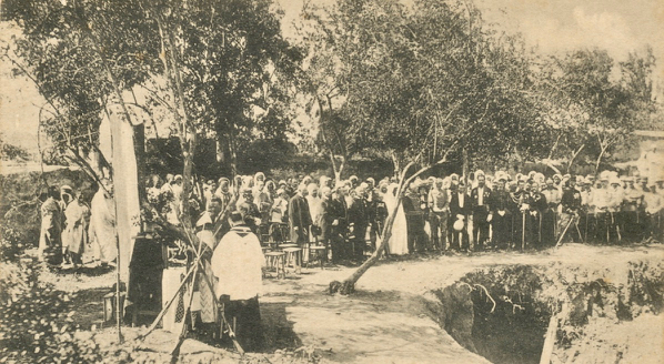 Avril 1912, service religieux et bénédiction des tombes des victimes en présence du Ministre de France, du général et des officiers du Corps d’occupation, dans la cour de l’hôpital militaire Auvert