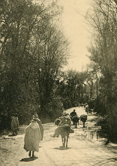 La route Fès-Sefrou, arrivée à Sefrou, d’une caravane de marchands. Cliché Maîtrejean, photographe sefrioui