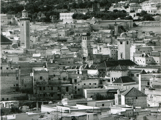 Image à la une : Un coin de la médina de Fès, photographie prise du sud : le quartier de Karaouiyine et la Koubba abritant le tombeau d’Idriss II. Cliché vers 1950 (probablement de Jacques Belin).