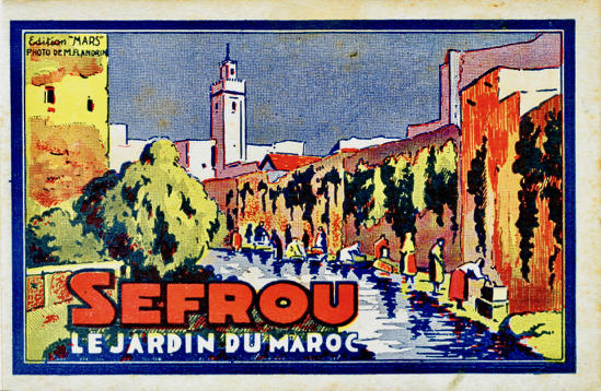 Sefrou, « la Cité des Cerises », blottie dans un nid de verdure, est en 1949 une ville de 20 000 habitants environ : 12 000 Musulmans, 7 000 Juifs et 7 ou 800 Européens, majoritairement Français ; trois quartiers : la médina et le mellah regroupés derrière des murailles rousses et crénelées et la « ville-nouvelle » où habitent la plupart des Européens. On peut rattacher à Sefrou, El-Klâa, gros bourg pittoresque … et peu accueillant, situé à quelques centaines de mètres sur la route du fort Prioux et des cascades : ses habitants sont des maraichers ou les propriétaires des petits jardins cultivés le long de l’oued Aggaï. Toute la ville de Sefrou est à cette époque entourée de magnifiques jardins, sur plus de six mille hectares, qui ont valu à la cité le surnom de « Jardin du Maroc ».