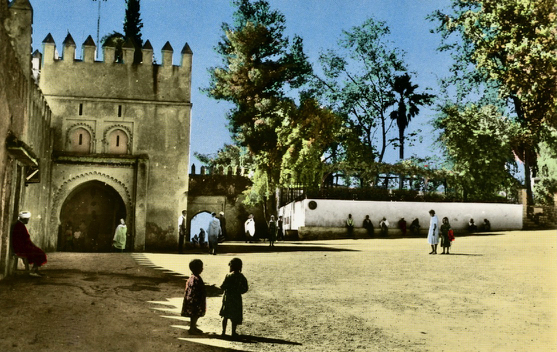 Bab Mkam dans les années 1950 avec à droite, le café maure, aujourd’hui disparu depuis longtemps