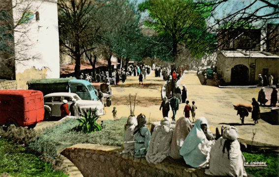 Place de Bab Merbah, avec à gauche le long du rempart les marchands ambulants ; à droite le bâtiment du marché municipal avec ses arcades.