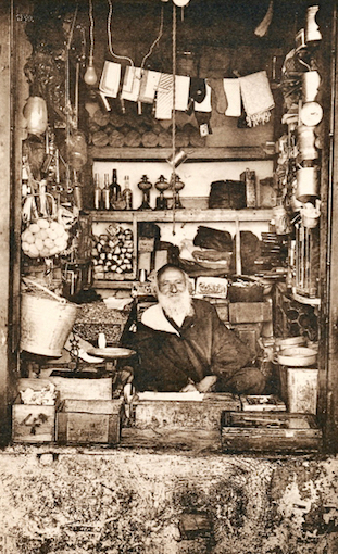 Entrés par la grande porte de Bab Mkam, nous rejoignons, en longeant l’oued Aggaï, le marché aux légumes de Bab Merbah, de l’autre côté de la médina. Les boutiques étroites du mellah et de l’ancienne médina sont de véritables encyclopédies de marchandises et on a parfois du mal à repérer le vendeur, pourtant assis en hauteur, mais perdu au milieu de ses articles disposés du sol au plafond : pains de sucre dans leur papier bleu, boîtes de thé, bouteilles d’huile, chandelles et lampes à pétrole (il n’y a pas encore l’électricité dans la majorité des maisons de la médina !), paquets vert-kaki d’allumettes « The Chariot », paquets de pâtes « Famo », pots de miel, sacs remplis de toutes les variétés de légumes secs et de toutes les épices nécessaires à la cuisine, écorces de cannelle, amandes, dattes en vrac, colliers de figues sèches, mais aussi henné en feuilles ou en poudre, rhassoul, savon noir beldi, blocs de savon de Marseille, etc…