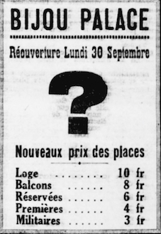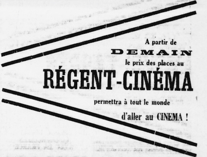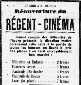 Ouverture du Bijou-Palace le 30 septembre 1935. Réouverture du Régent-Cinéma le 23 octobre 1935 après fermeture annuelle (depuis le 30 juin 1935). La concurrence est rude, il faut baisser les prix pour attirer le spectateur !