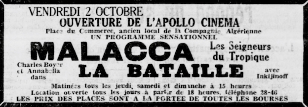 « Du spectacle, beaucoup de mouvement, de l’action, voilà ce que veut le public. Ce qui attire la masse, ce sont des films du genre de « Capitaine sans peur », « Caroline chérie », « Autant en emporte le vent », etc. Le « Bijou » donne souvent de bons films français qui, bien qu’ils ne soient pas toujours compris, tentent cependant le public. Ce fut le cas pour « Les mains sales ». Au cinéma « Apollo » dont la clientèle est surtout musulmane ou israélite, nous projetons des films égyptiens ou bien encore des films « mouvementés » qui nous viennent d’Amérique. Le Jardin d’été « Le Paris » qui fonctionne à partir de juin jusqu’à fin septembre donne le même genre de films qu’ailleurs, et sa clientèle a évidemment les mêmes préférences. »