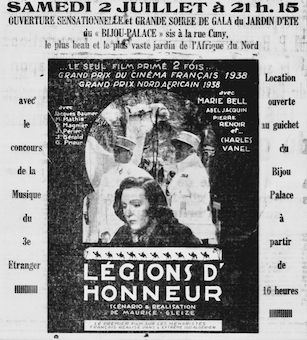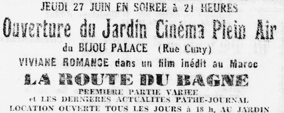 Le 2 juillet 1938 a lieu la séance inaugurale du Jardin d’été du Bijou Palace, rue Cuny, avec le film « Légions d’honneur » grand prix du cinéma français en 1938, de Maurice Gleize. Propriété de la famille Tosi, c’est un cinéma confortable et moderne avec 400 fauteuils « berbères », et dont la réalisation a été confiée à l’entrepreneur fasi M. Belvisi ; il est qualifié de « plus beau jardin d’été de l’Afrique du Nord » !! La grande innovation de M. Tosi est de permettre aux spectateurs de consommer pendant la projection. Pour cela des tables numérotées sont installées et c’est M. Guillen de la Renaissance qui dirige le bar.