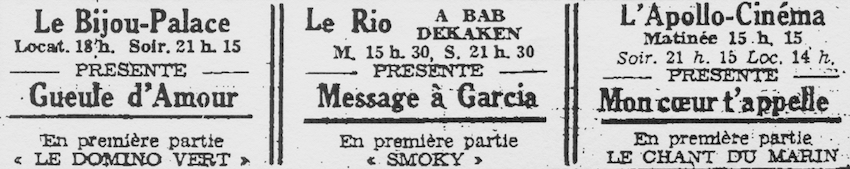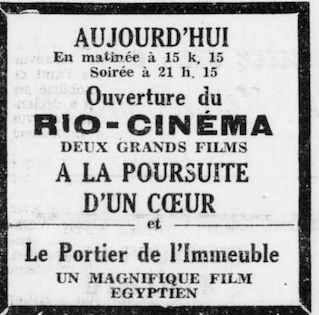 On note le 13 avril 1938 un programme complet égyptien au Régent, avec Grand Pèlerinage à la Mecque, les fêtes du couronnement du roi Farouk 1er, les sketchs et danses de Badia Massabni et le film Dernière solution. À partir de 1938, les films égyptiens « parlant et chantant » en arabe, avec sous titres français sont plus fréquents surtout au Rio et au Cinéma de Boujeloud.