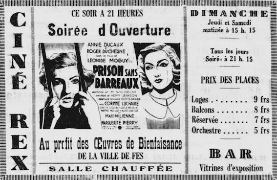 L’ouverture inaugurale a lieu le 24 décembre 1938 (avec ou sans Père Noël ?) et la recette de la soirée est au bénéfice des œuvres de bienfaisance de la ville de Fès. Le film est « Prison sans Barreaux » de Léonide Moguy avec Annie Ducaux et Roger Duschesne.