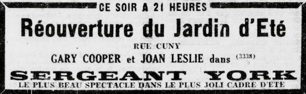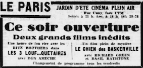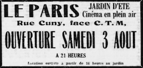 Pour une raison que j’ignore, les annonces de programmation du cinéma de plein-air de la rue Cuny à partir de la saison 1943 et pendant 3 ans sont faites sous le nom de Jardin d’Été, le nom « Le Paris » ne réapparaît qu’en 1946 ; mais contrairement à ce qui a été parfois écrit le Jardin d’Été/Le Paris n’a jamais été fermé de 1939 à 1948.