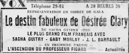 – l’Ascension du Professeur Picard, les Actualités, et le film Le destin fabuleux de Désirée Clary (1942) : histoire du premier amour de Bonaparte, traité par Sacha Guitry.