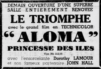 Le film inaugural est Aloma, princesse des îles…en technicolor. La programmation change tous les lundis. Le Triomphe a un toit ouvrant à panneaux coulissants qui permet de profiter de la fraîcheur les soirs d’été.