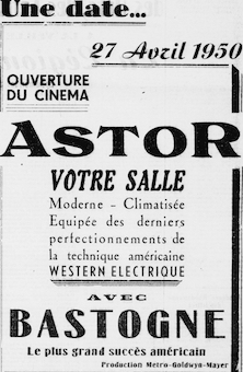 Le 27 avril 1950, l’Astor succède au Vox. Pour son ouverture la nouvelle salle offre au public fassi le film Bastogne … presque en même temps qu’à New-York ou à Paris, villes où le lancement a eu lieu fin janvier 1950 ; le titre anglais Battleground identifie davantage le thème du film à la gloire de la 101ème division aéroportée américaine engagée lors de la bataille de Bastogne, nom qui aujourd’hui, pour beaucoup d’entre nous, évoque davantage la classique cycliste Liège-Bastogne-Liège que la bataille des Ardennes en décembre 1944 !