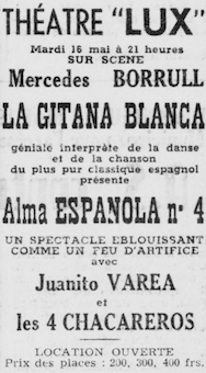 Le Lux propose fréquemment des attractions ou des spectacles de music-hall, en alternance avec les films. À gauche, programme du 23 décembre 1949 ; à droite programme du 12 mai 1950