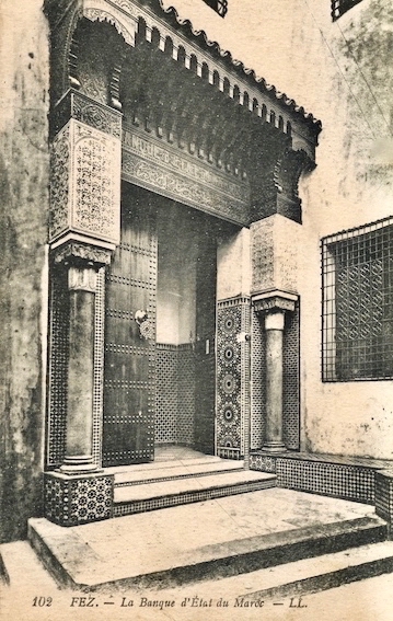 Image à la une : Entrée de la banque d’État en médina de Fès, quartier d’El-Kettanine. Ancien fondouk acquis en 1917 par la banque d’État du Maroc et converti en 1921 en succursale bancaire.