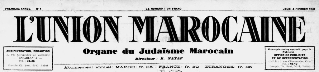 L’Union Marocaine, sous-titré Organe du Judaïsme Marocain, est lancé le 4 février 1932, à Casablanca, sous la direction de Élie NATAF, israélite français d’origine tunisienne, installé au Maroc depuis 1912 où il était directeur d’école de l’Alliance Israélite Universelle. Lorsqu’il fonde L’Union Marocaine Nataf est secrétaire du Comité de la Communauté israélite de Casablanca.