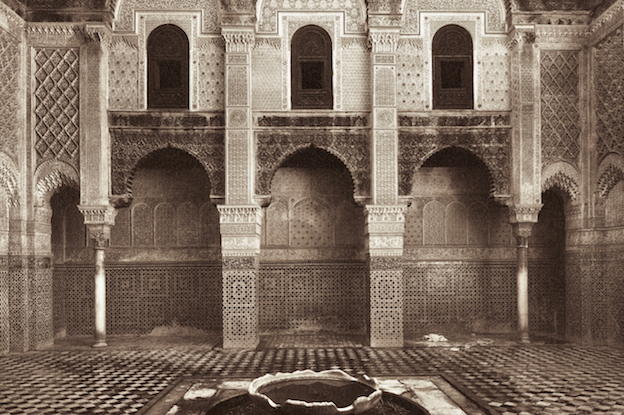Si Fès est restée une grande capitale religieuse, elle n’a cessé d’être au cours des âges une capitale intellectuelle avec de fins lettrés et de doctes savants. À Karaouiyine, l’antique université, affluent des milliers d’étudiants venus de toutes les provinces du Moghreb, depuis la rive méditerranéenne jusqu’aux confins sahariens : Rif, Djebel, Gharb, Doukkala, Chaouia, Tafilalet, etc. Tous ces étudiants ou tolba, logent dans les médersas, établissements qui tiennent à la fois de la mosquée et de l’hôtellerie. Les tolba vivent ascétiquement à deux ou trois par chambre, partageant leur temps entre les études et la prière. Leurs locaux, exigus et nus comme des cellules monastiques, aux murs blanchis à la chaux, contrastent avec la splendeur du décor environnant. À ces époques de foi, où tout était pour Dieu, et le minimum pour les hommes, l’architecte a déployé tout son art pour la salle de prière et son accès, le patio, que centre la vasque aux ablutions.