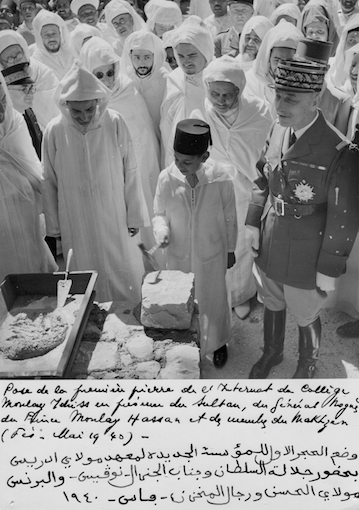 Pose de la première pierre de l’internat du Collège Moulay Idriss en présence de S.M. le Sultan Mohammed Ben Youssef, du général Nogues, du prince Moulay Hassan et des membres du Maghzen. Mai 1940