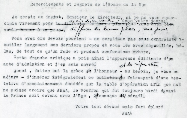 « Aussi faites-moi la grâce, l’honneur et la réparation – au besoin je vous en adjure – d’insérer intégralement ce faire-part d’une tentative d’assainissement décédée sur la table d’opération afin que nul ne puisse croire que JHÂA, bouffon qui fut toujours hardi devant le Prince soit devenu avec l’âge eunuque au sérail.