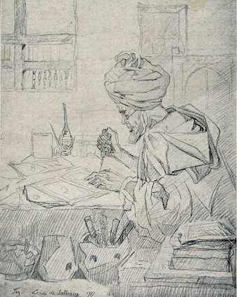 Image à la une : Si Mohamed ben El Arbi Lahlou, chef de l’atelier des relieurs de Fès. Dessin de Condo de Satriano. 1917