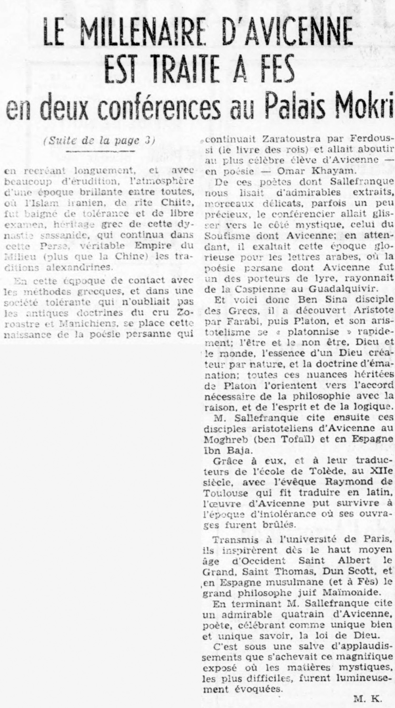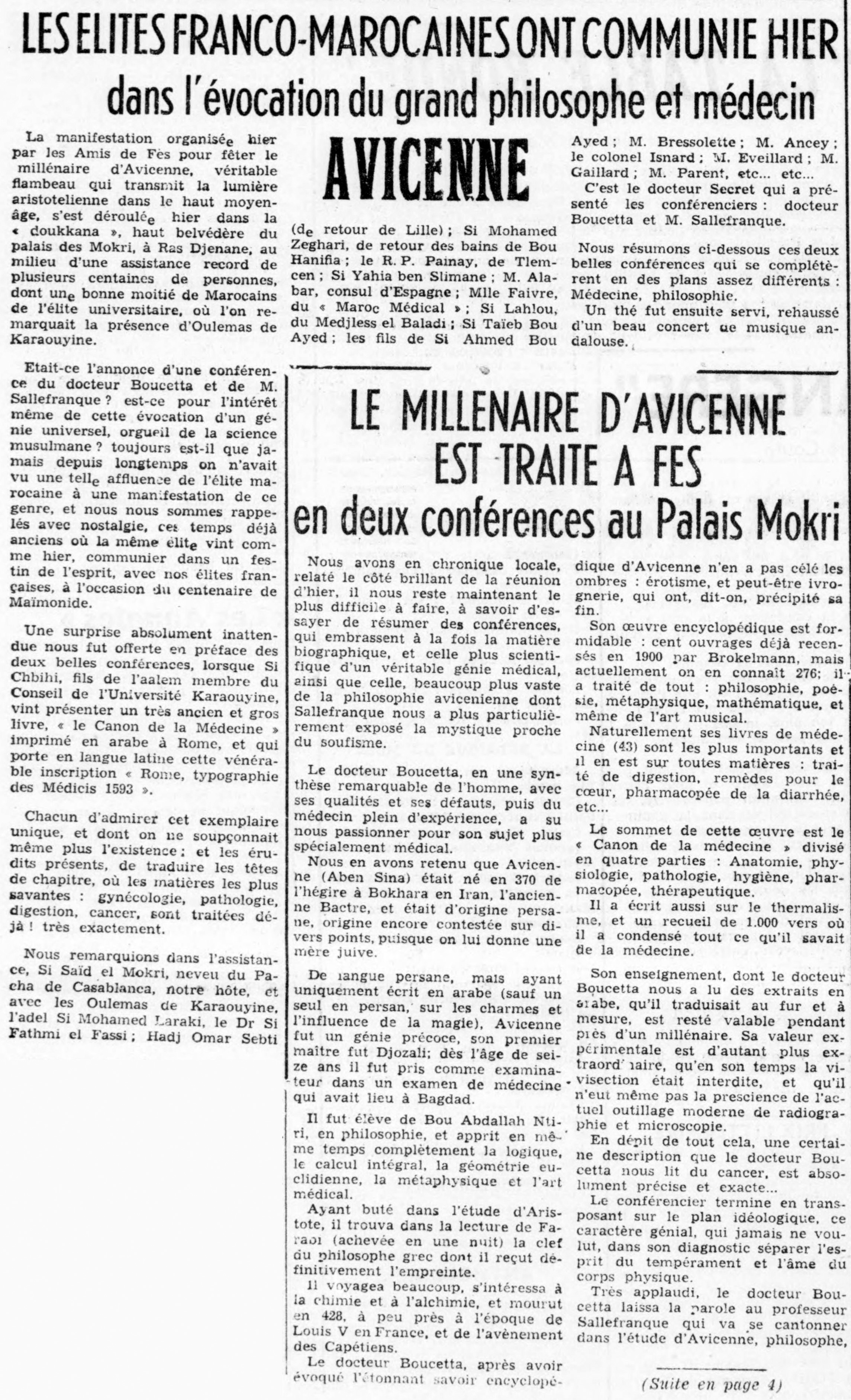 **** Annonce de la conférence sur Avicenne. Courrier du Maroc du 14 mai 1951.
